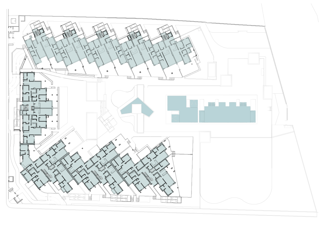 Consta de una planta de semisótano, donde se encuentran los aparcamientos, los trasteros y parte de las instalaciones, cinco plantas en altura en las que se distribuyen las viviendas de dos y tres dormitorios y unos amplios jardines con zonas verdes, áreas de descanso y piscinas.
