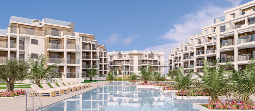 Las viviendas están dotadas con amplias terrazas con barandillas acristaladas y envidiables vistas hacia el mar Mediterráneo. Además, las plantas bajas en los extremos de los bloques disponen de jardines privados.