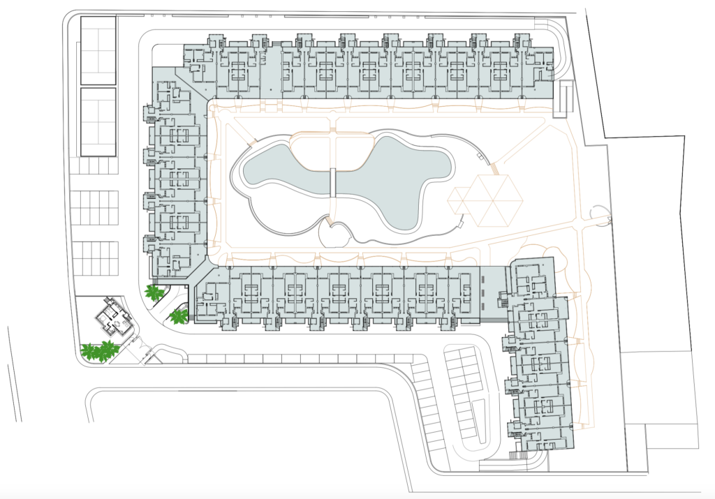 Consta de una planta de semisótano, donde se encuentran los aparcamientos y parte de las instalaciones, cinco plantas en altura en las que se distribuyen ciento cincuenta y cinco viviendas de dos y tres dormitorios, jardines, pistas de pádel y piscinas.