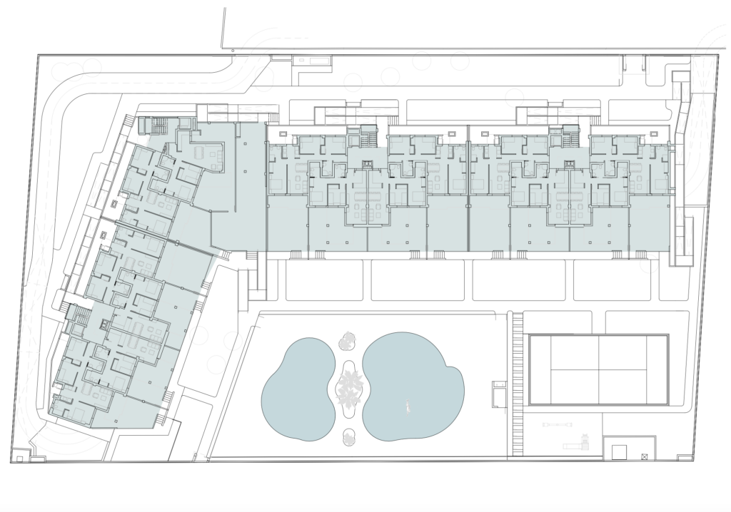 Consta de una planta de semisótano, donde se encuentran los aparcamientos, los trasteros y las instalaciones, cuatro plantas en altura en las que se distribuyen cuarenta y nueve viviendas en cuatro escaleras, jardines y pistas de pádel y piscinas.